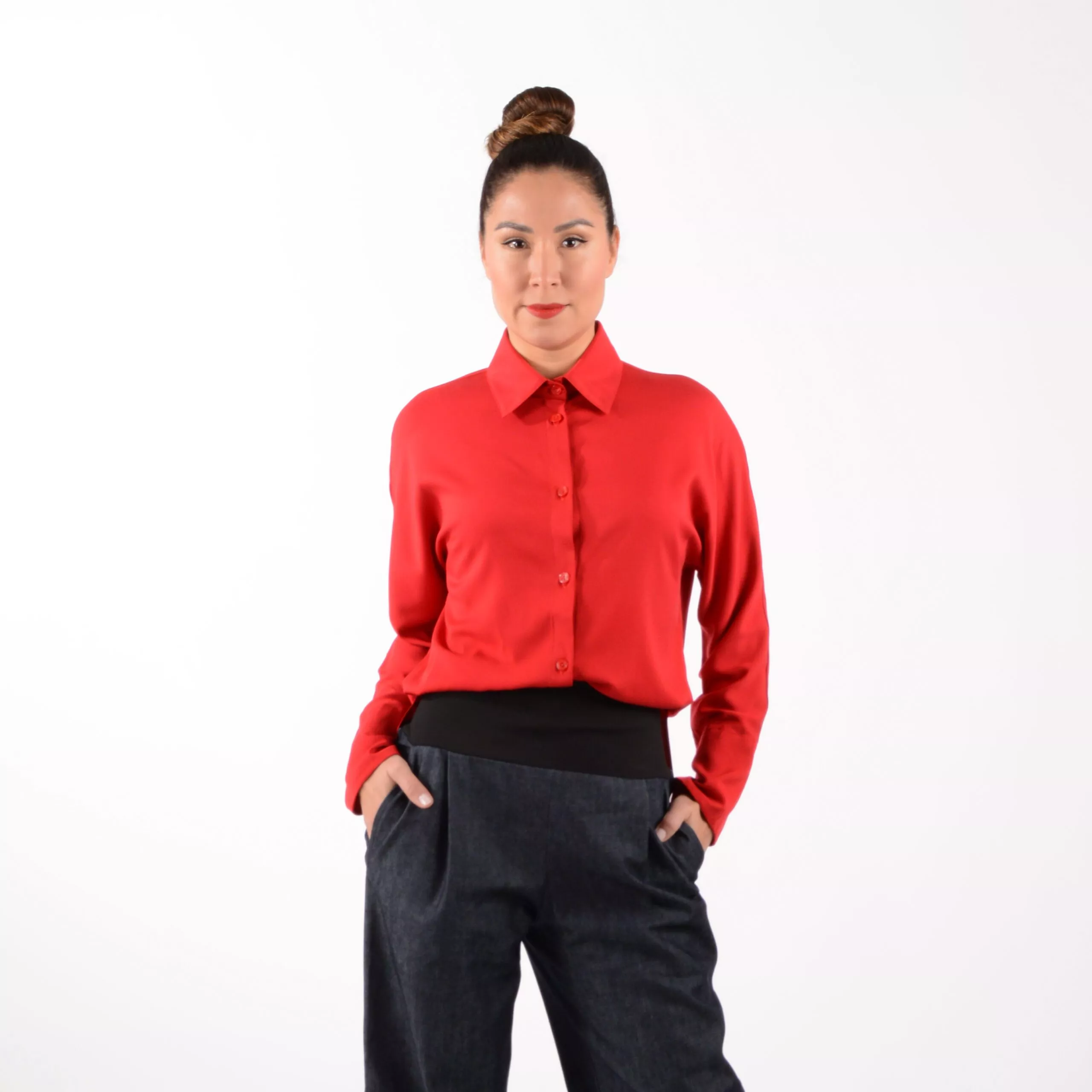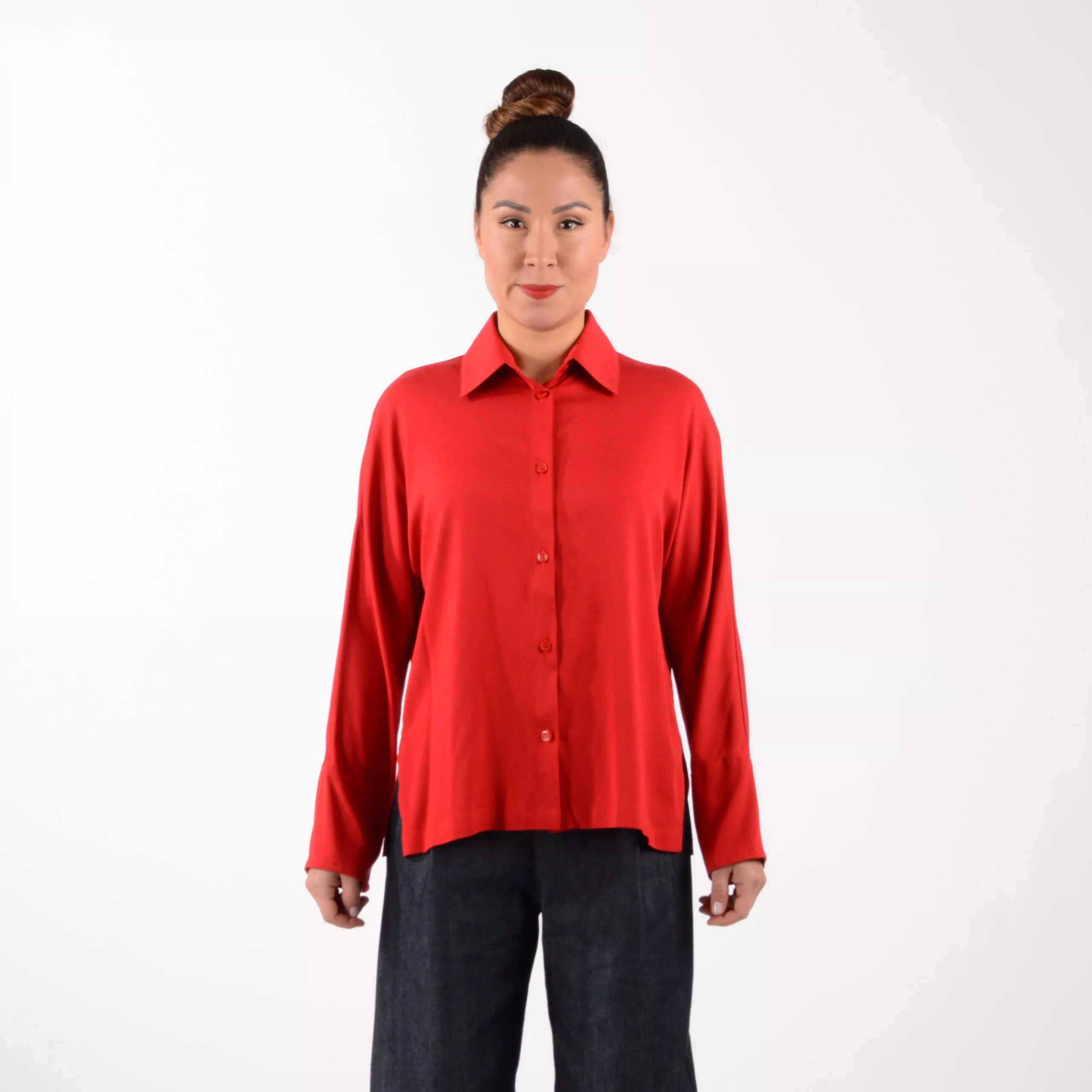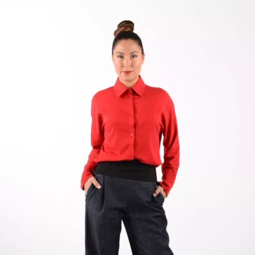 Das Hemd ELLI aus hochrotem weich fließenden Viskose Material.