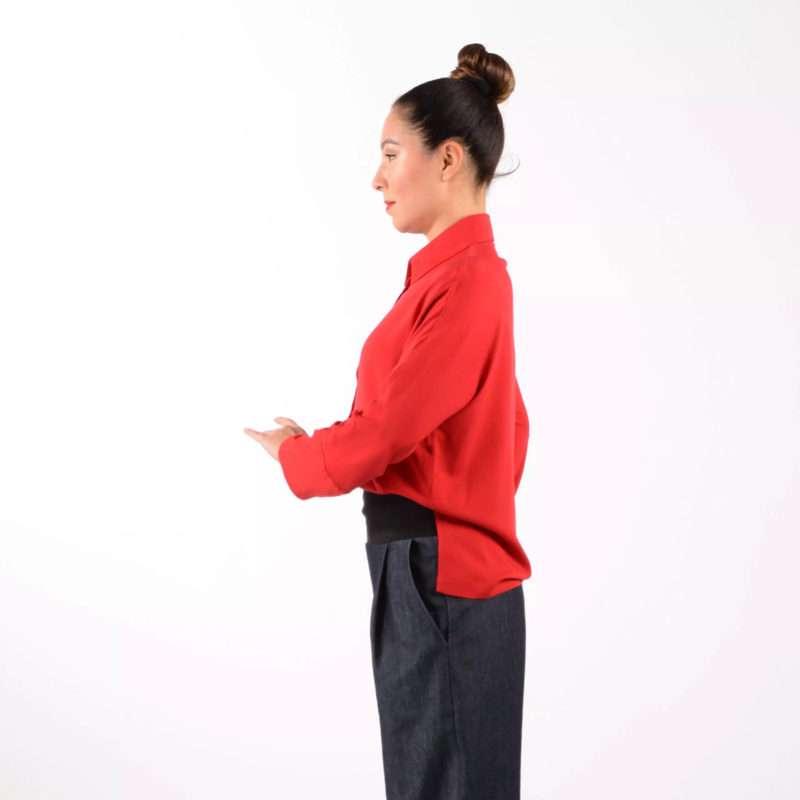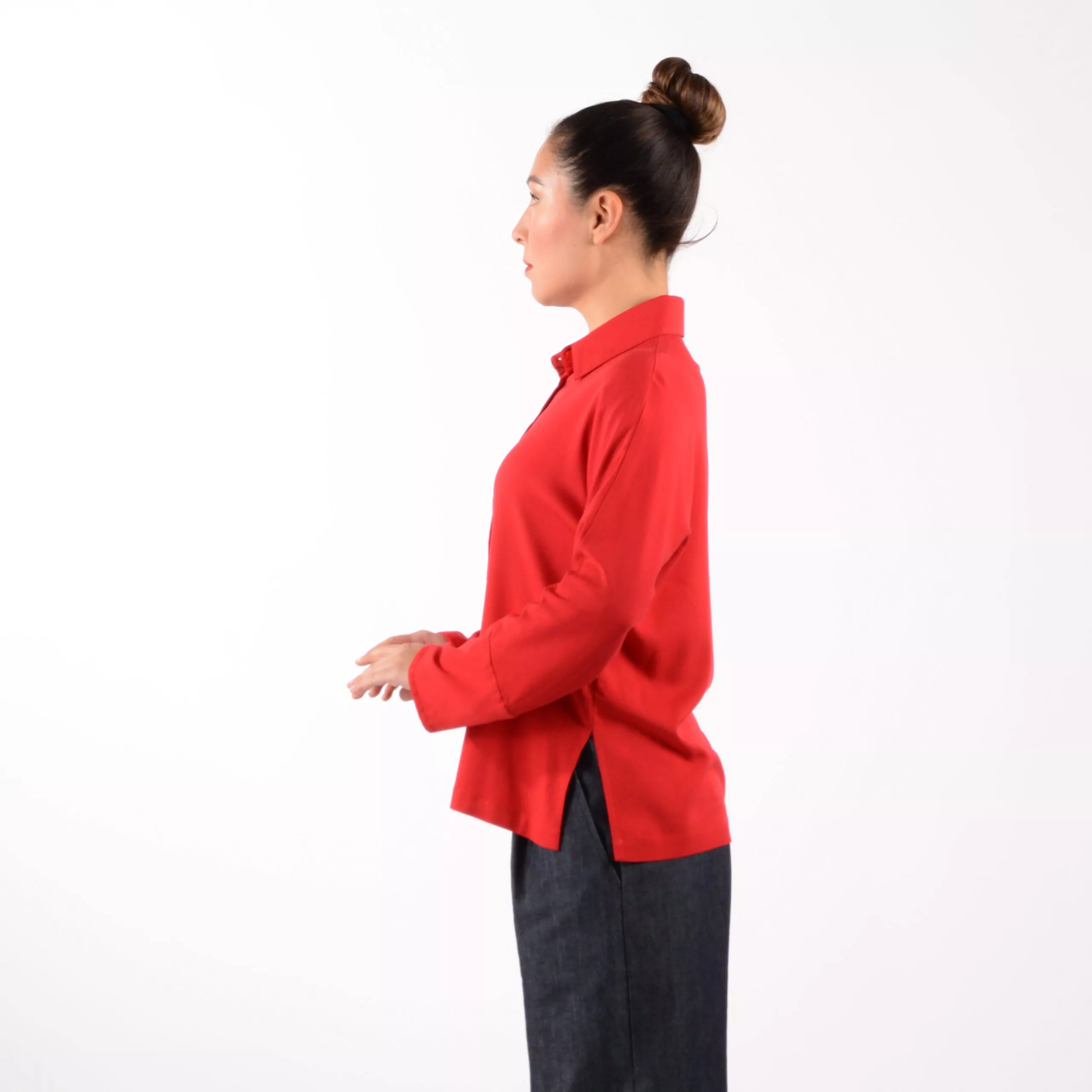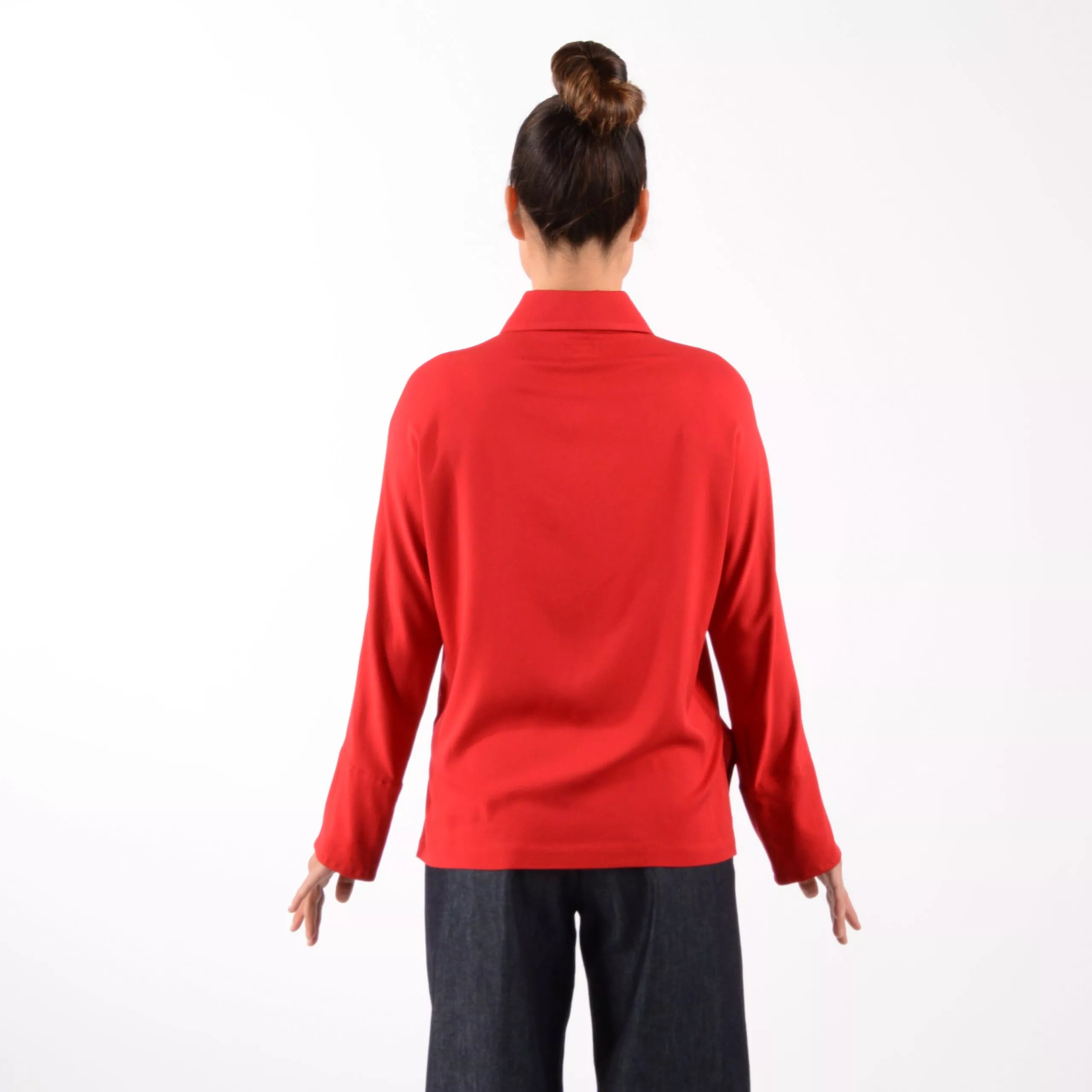 Das Hemd ELLI aus hochrotem weich fließenden Viskose Material.