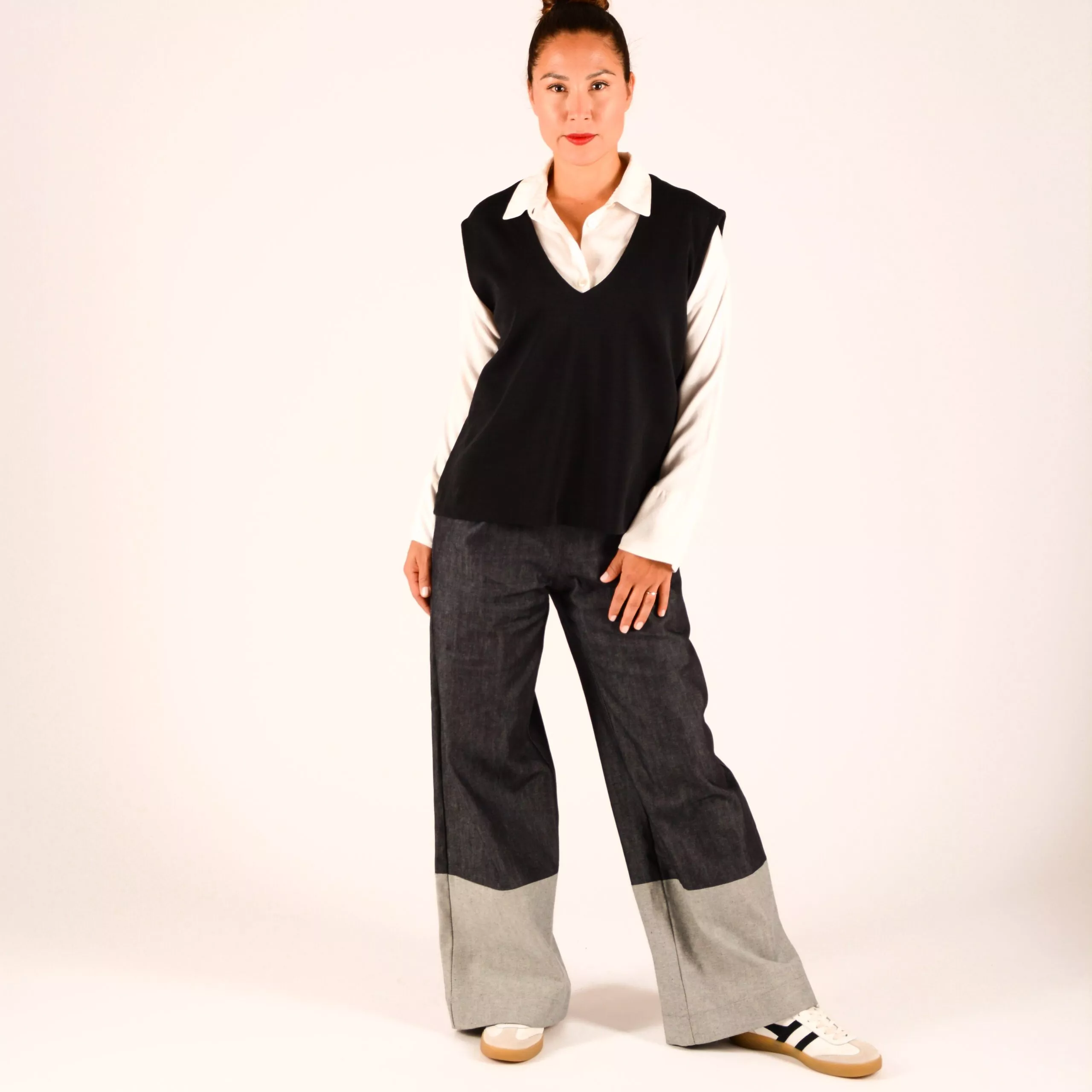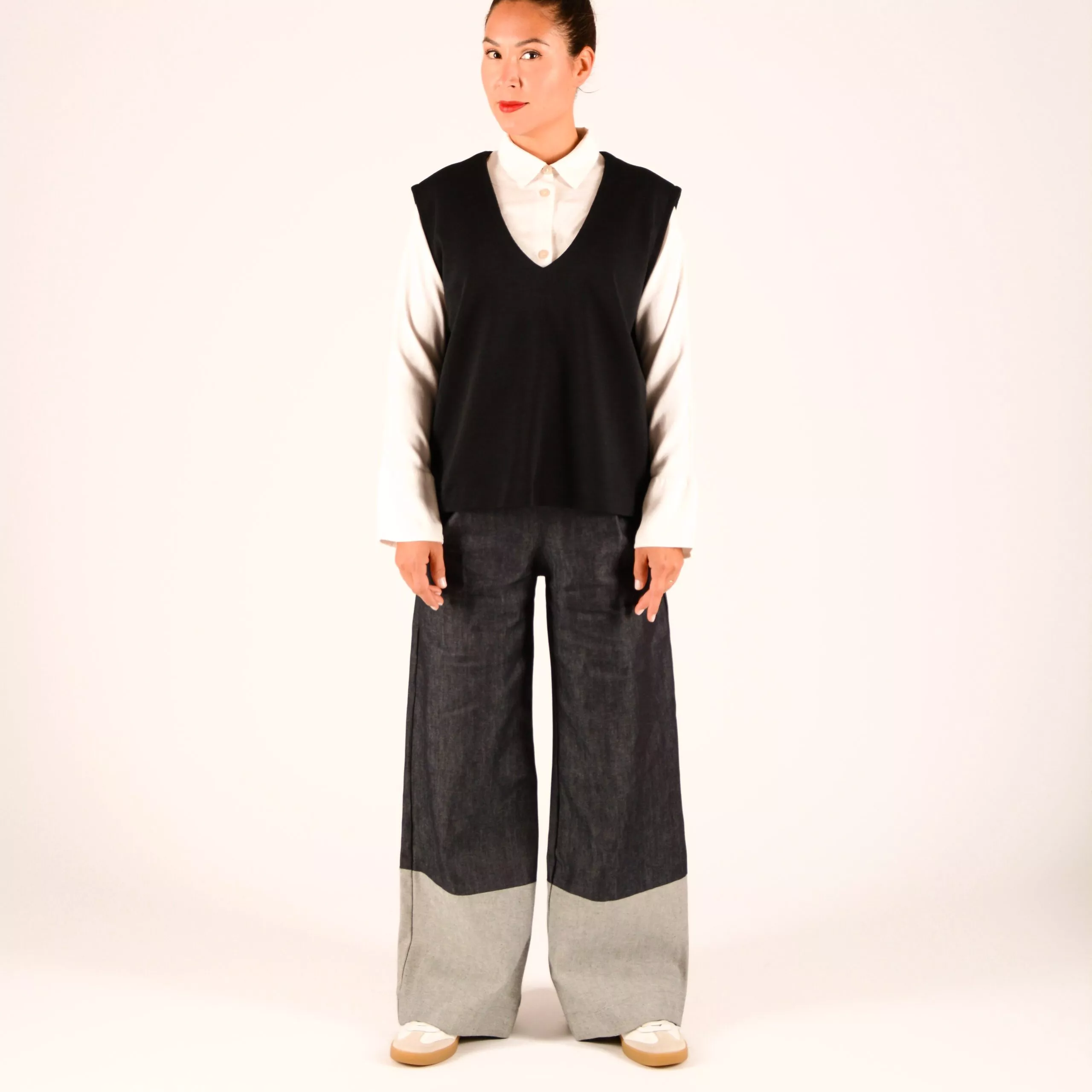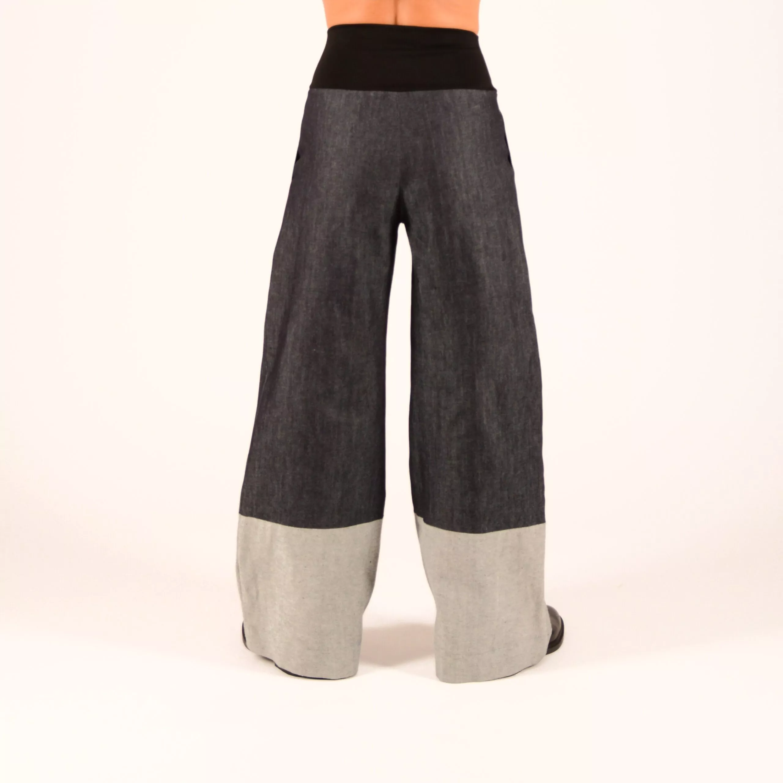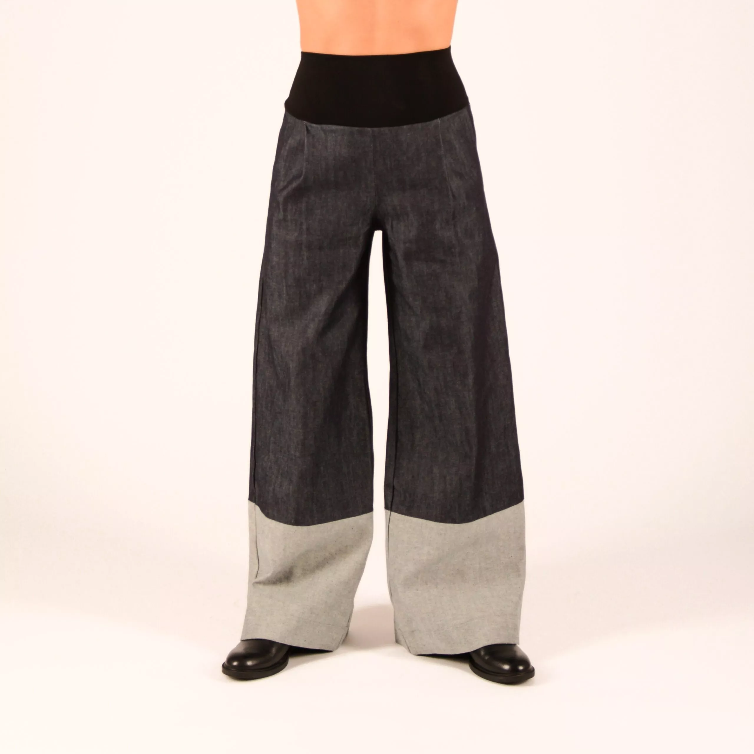 Hose im Marlene Stil im Denim Mix, aus dunkelblauem Jeansstoff mit hellem Hosenbein.