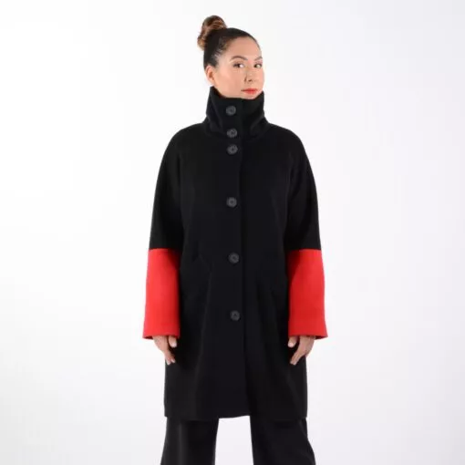 Mantel FRANKA aus weicher Wolle mit rotem Kontrast am Ärmel als Blickfang.