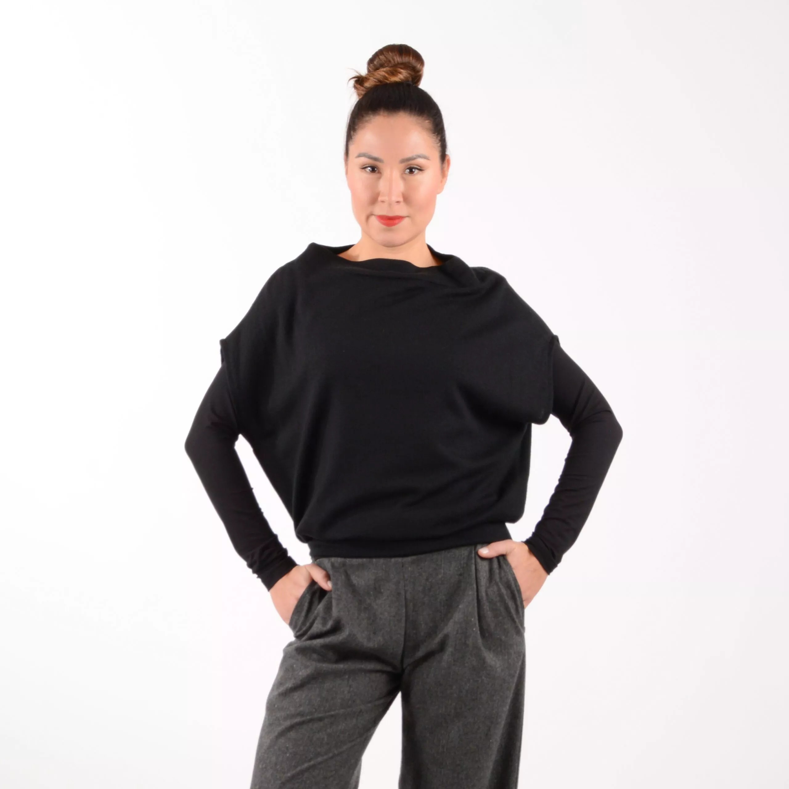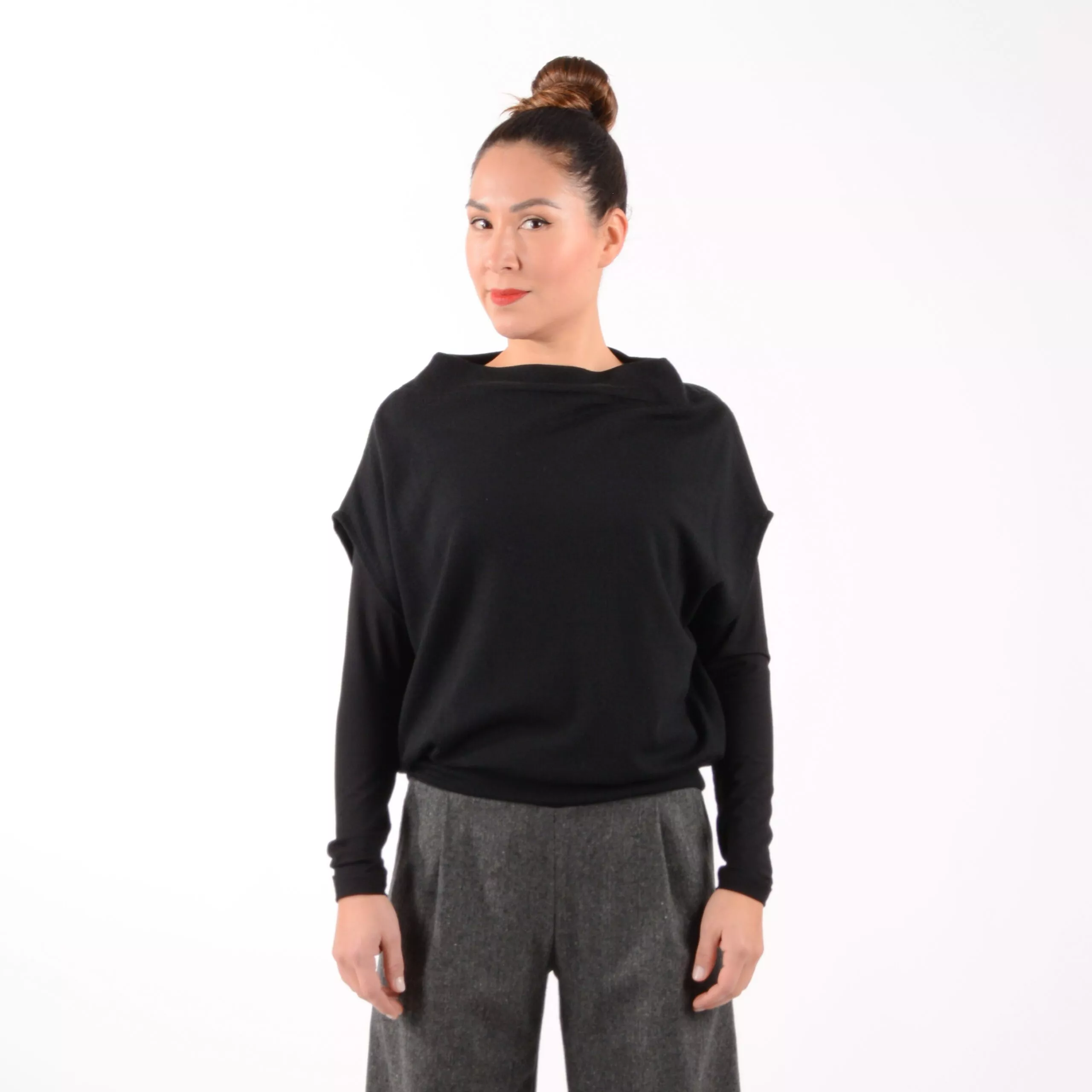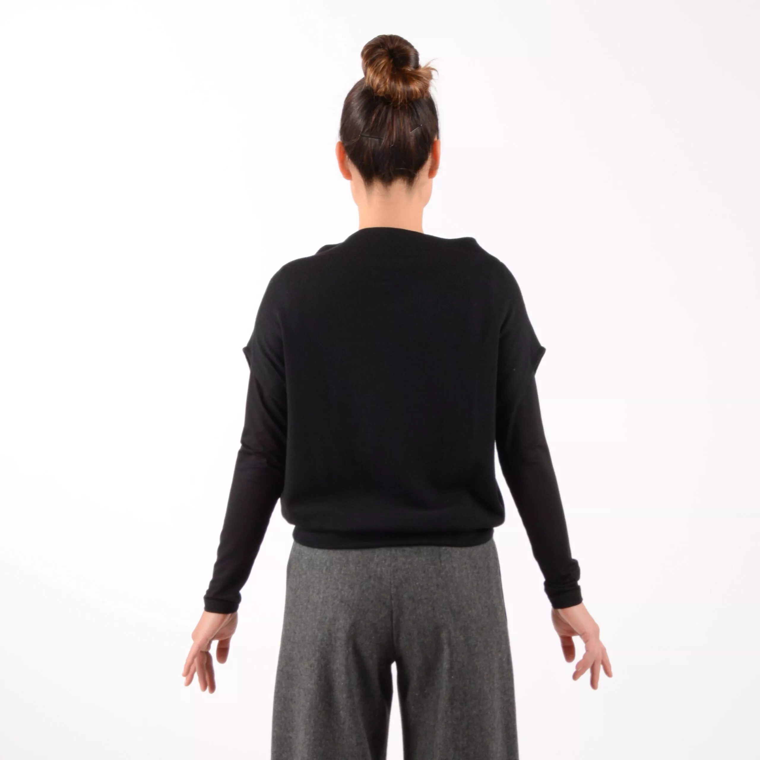 Pullunder aus 100% Feinstrick Merinowolle in Schwarz, mit Bündchen an der Länge, leicht angeschnittenen Kelchkragen und überschnittener Schulter. Super kombinierbar mit unseren Basics wie zum Beispiel das Langarmshirt KATE, oder auch über Hemden wie unser Modell Ellie.