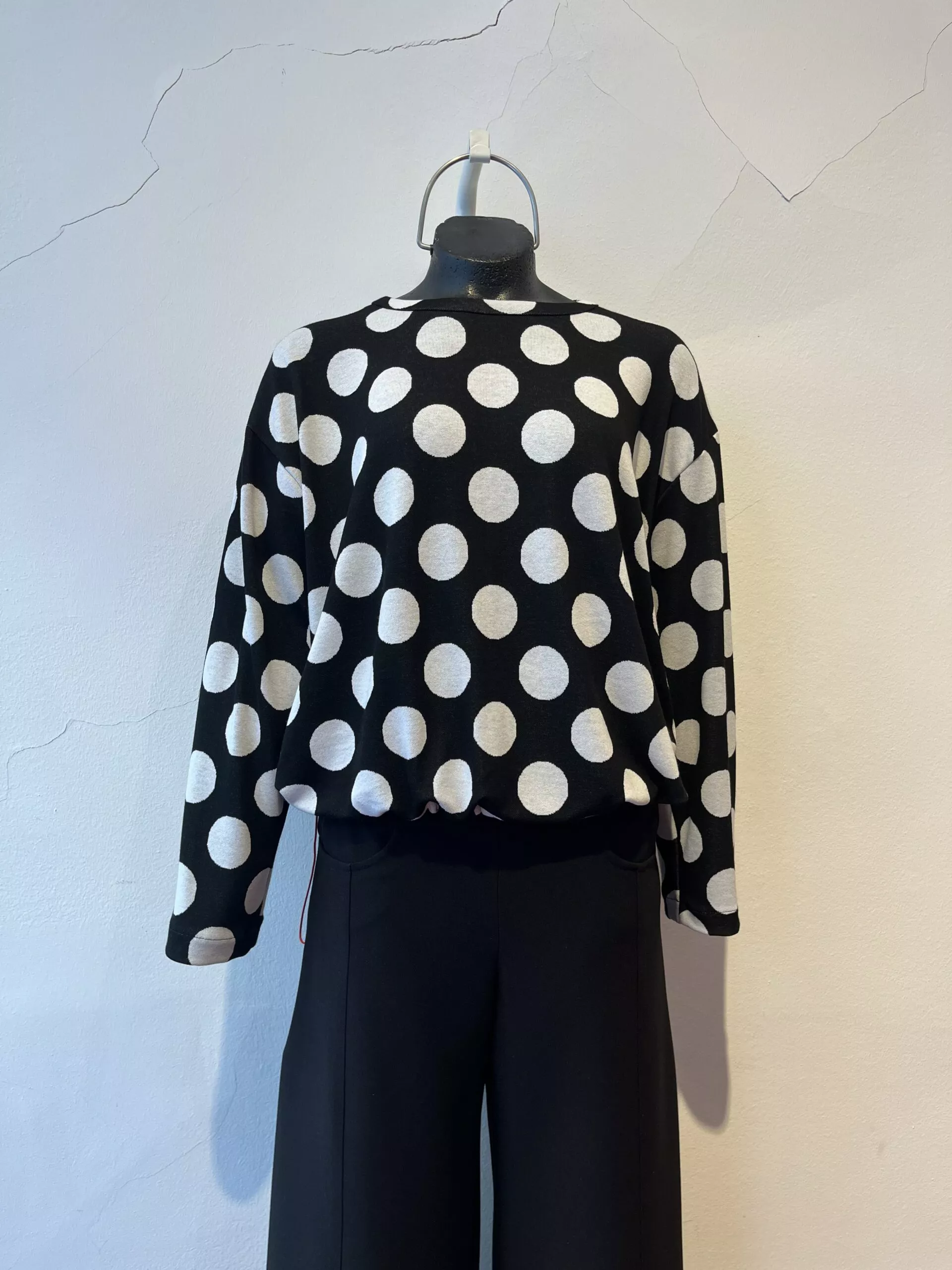Der Pulli LINA in schwarz mit weißen, großen Tupfen ist ein locker geschnittenes Oberteil. Im Saum ist eine verstellbare rote Gummischnur eingearbeitet. Hier kann die Weite individuell eingestellt werden und es ergeben sich verschieden Styles.