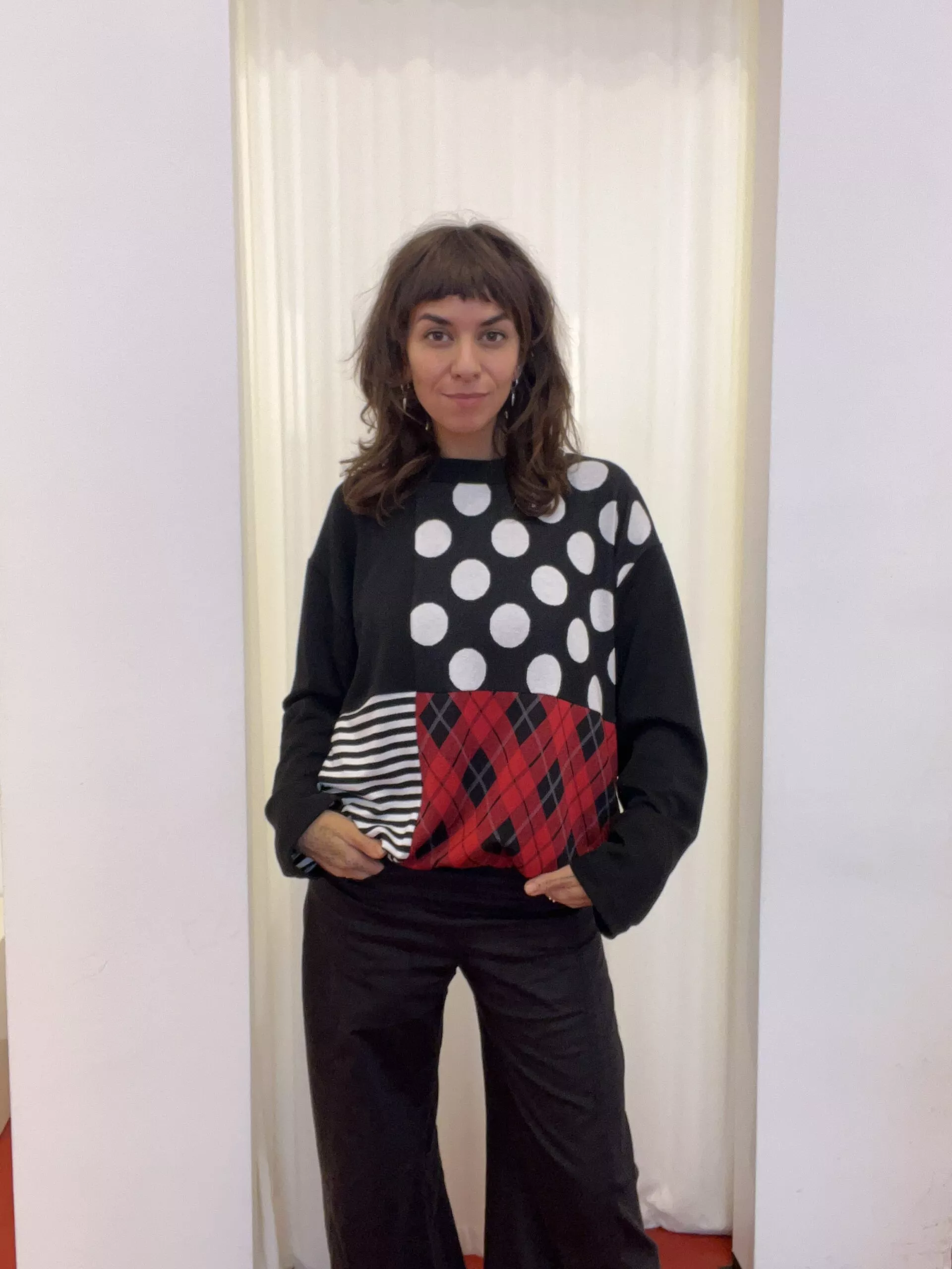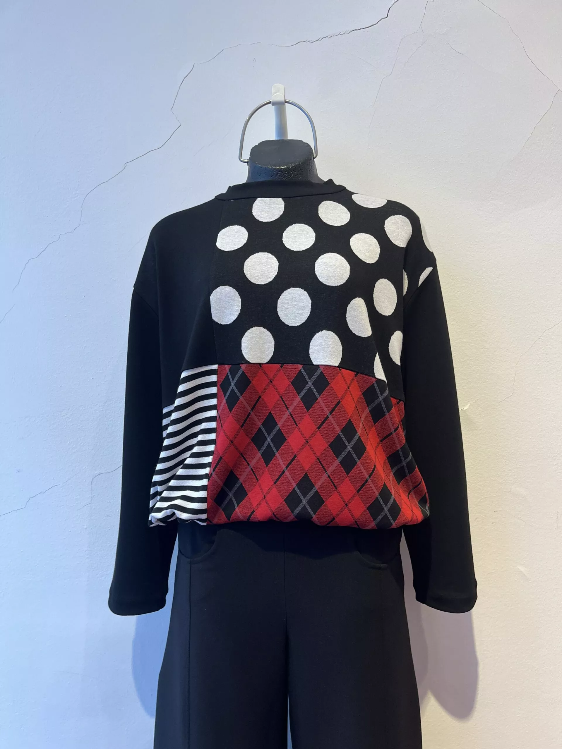 Der Pulli LINA mit gemischten Mustern, kariert, gepunktet und gestreift, ist ein locker geschnittenes Oberteil. Im Saum ist eine verstellbare schwarze Gummischnur eingearbeitet. Hier kann die Weite individuell eingestellt werden und es ergeben sich verschieden Styles.