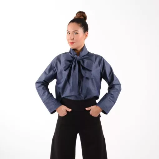 Die „Schluppenbluse Jeans-Blau“ aus einem schönen Hemdmaterial aus 100% Baumwolle.