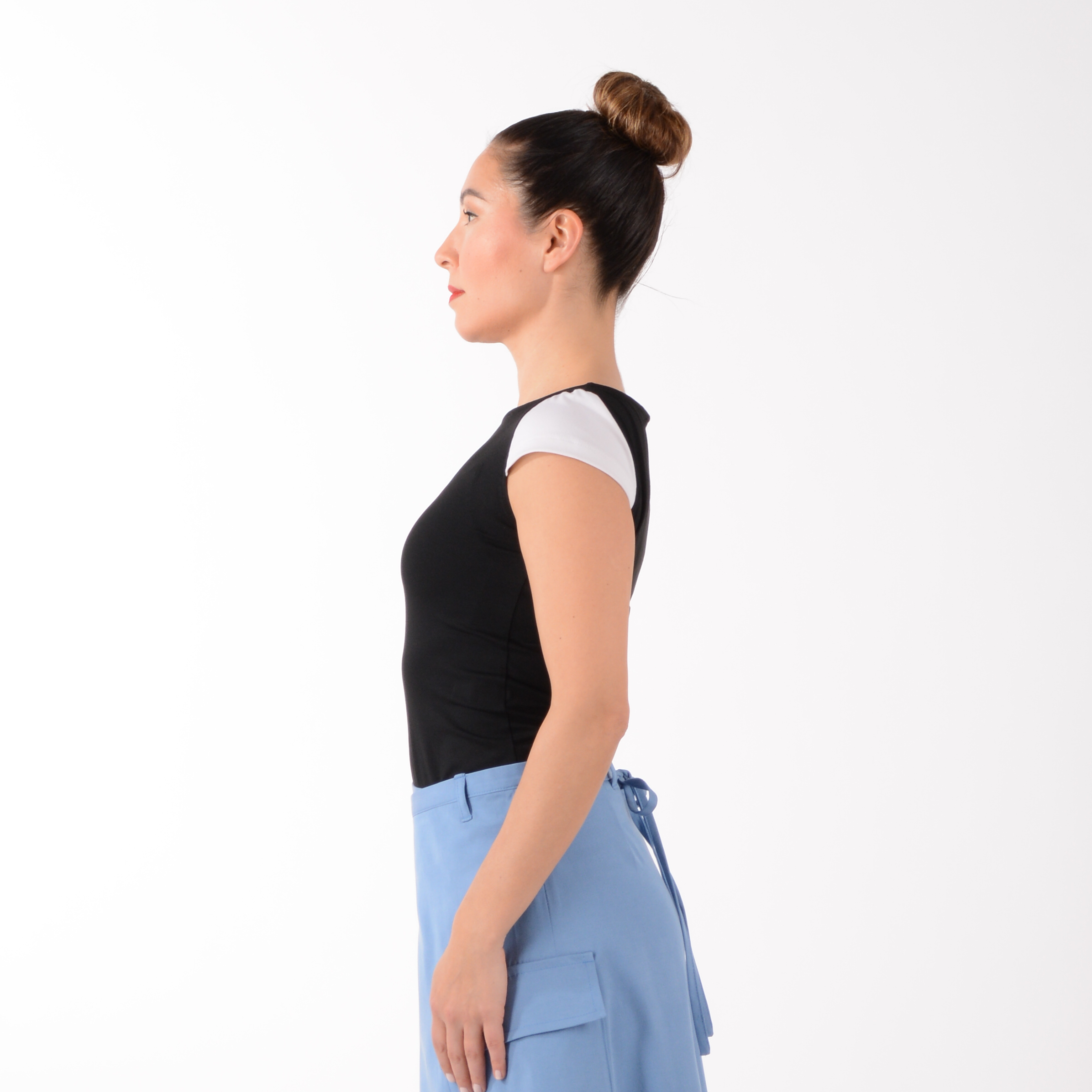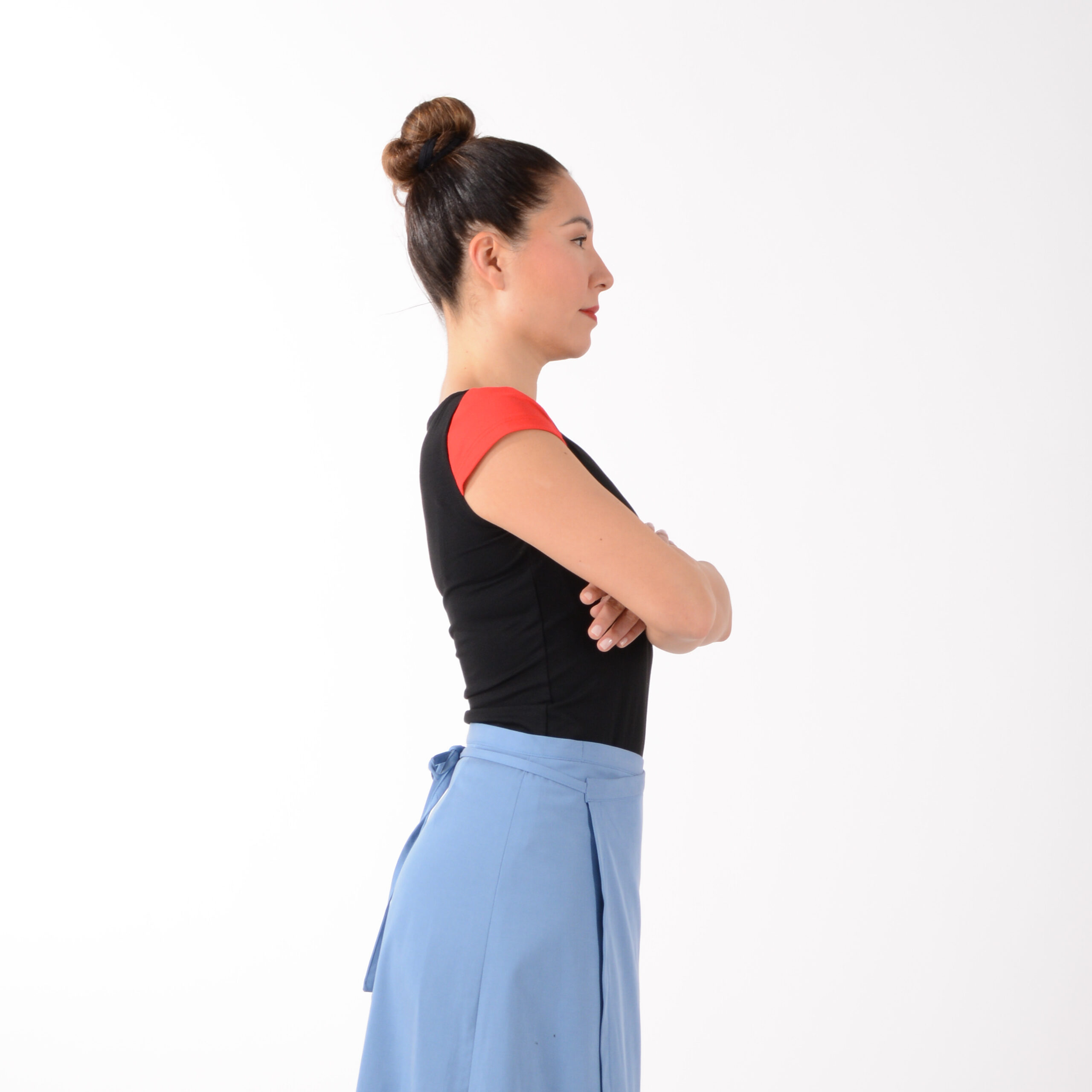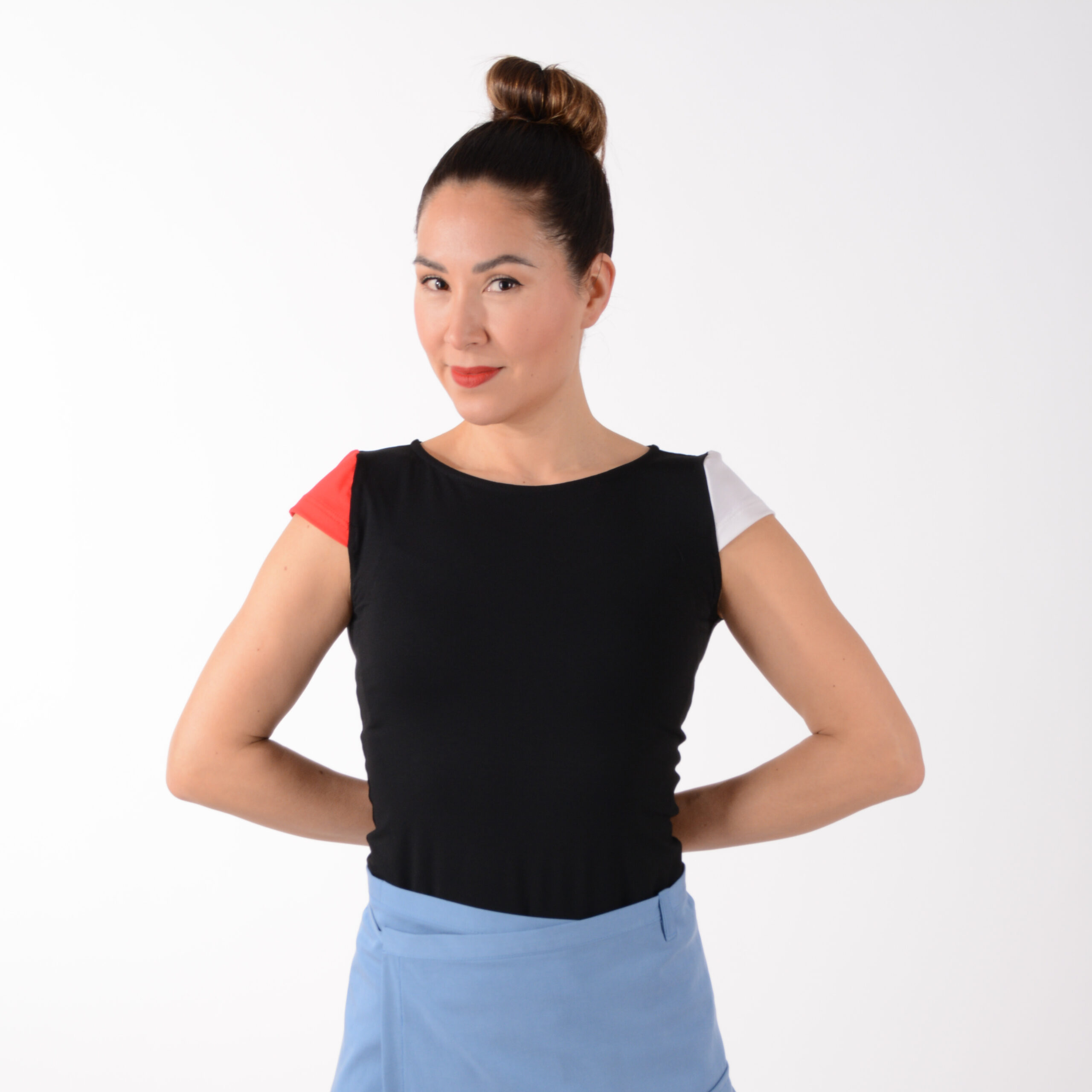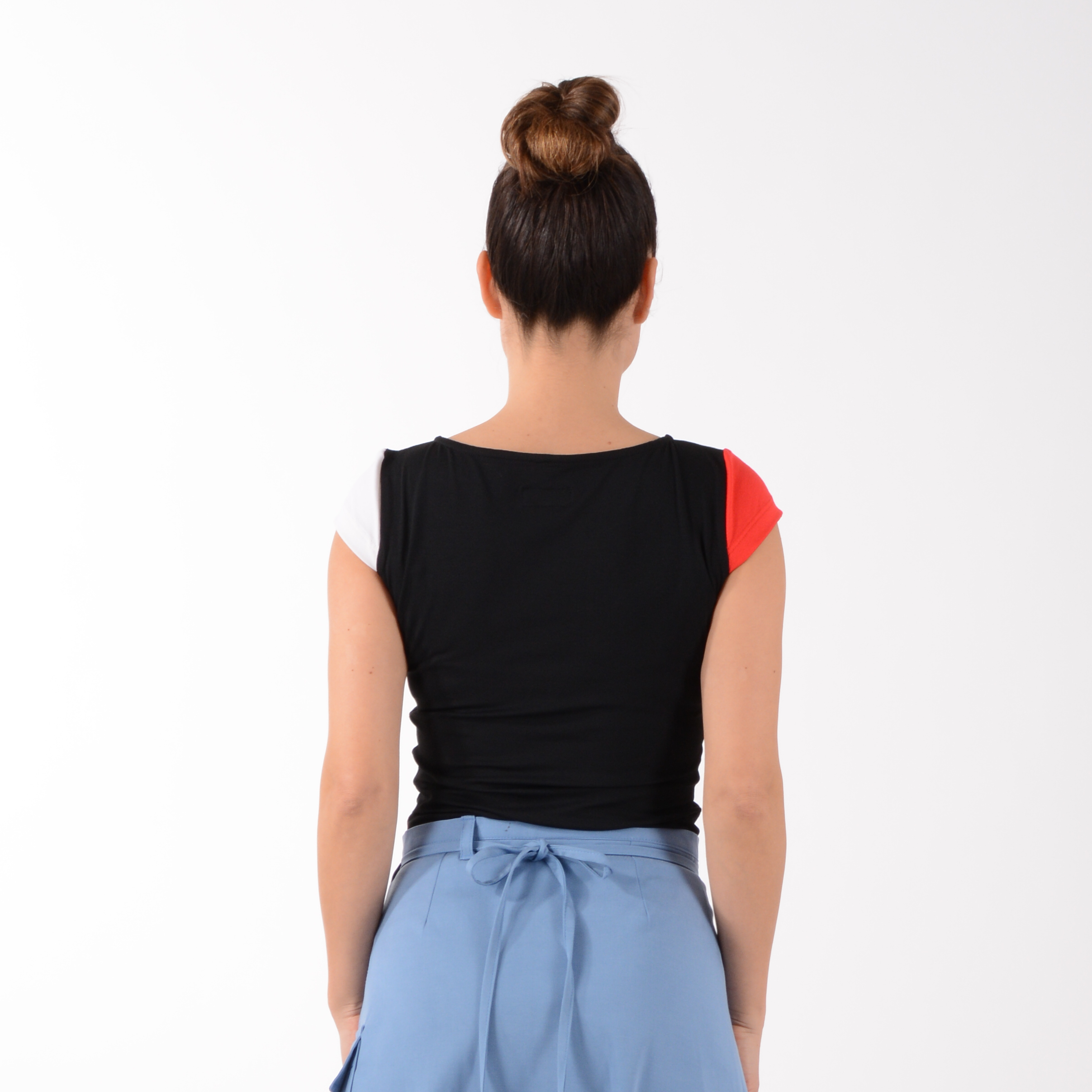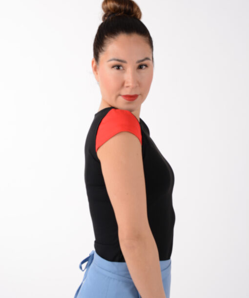Shirt LIZ – schwarzes Shirt aus weichem Viskose-Jersey – leicht und angenehm auf der Haut – in körpernaher Form. Die kurzen Mini-Ärmel in Rot und Cremeweiß liegen elegant auf der Schulter und machen dieses Shirt zum dezenten Hingucker.