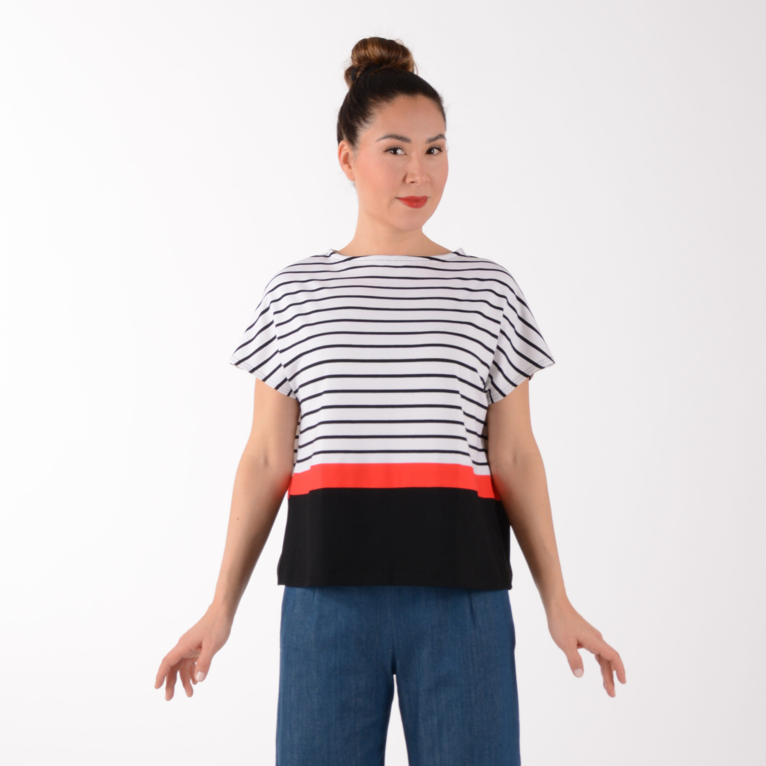 Shirt LORY in seinem schwarz-weiß Streifen Design gemischt mit Rot und Schwarz und seiner klaren Form, entspricht es einem typischen ULLIKO Entwurf.