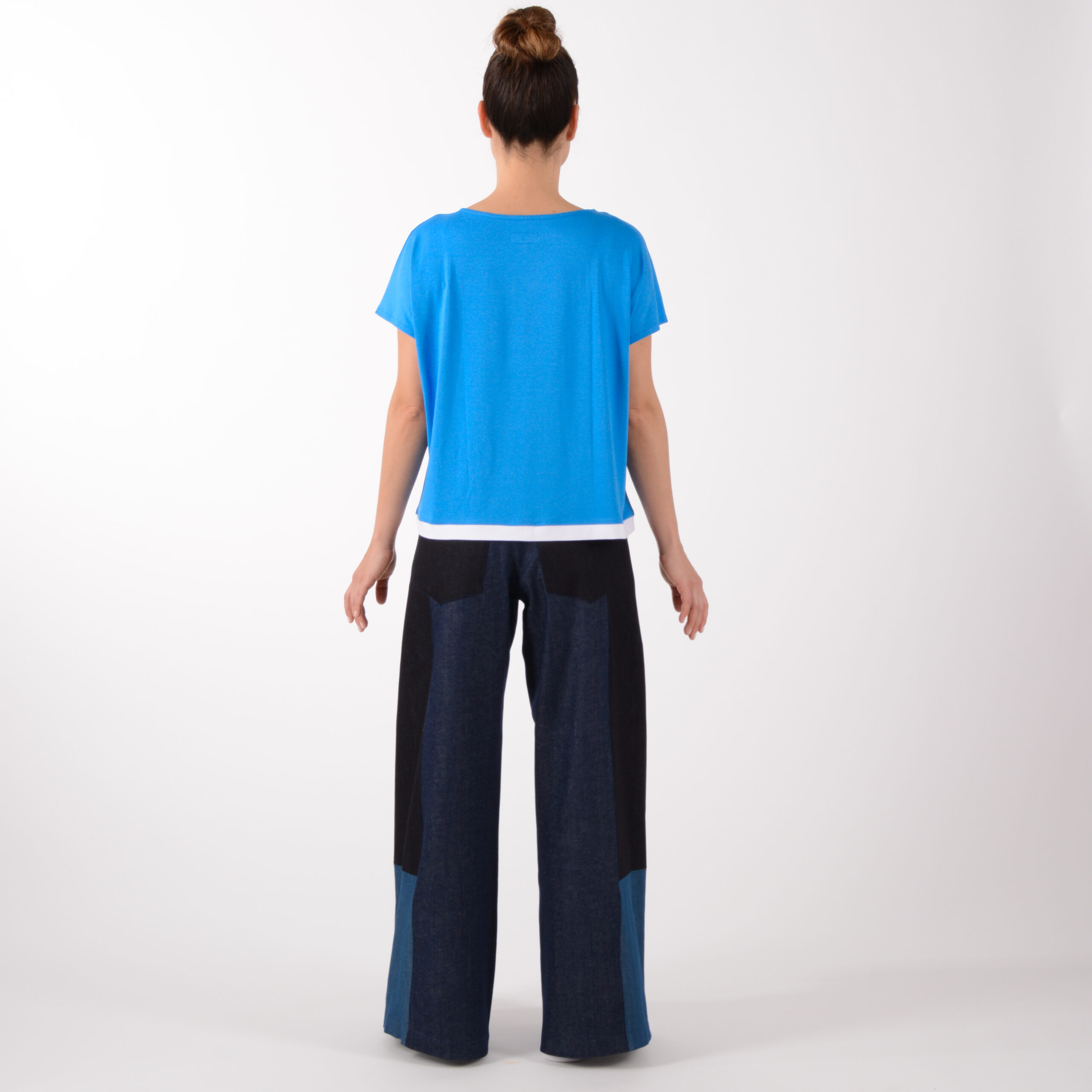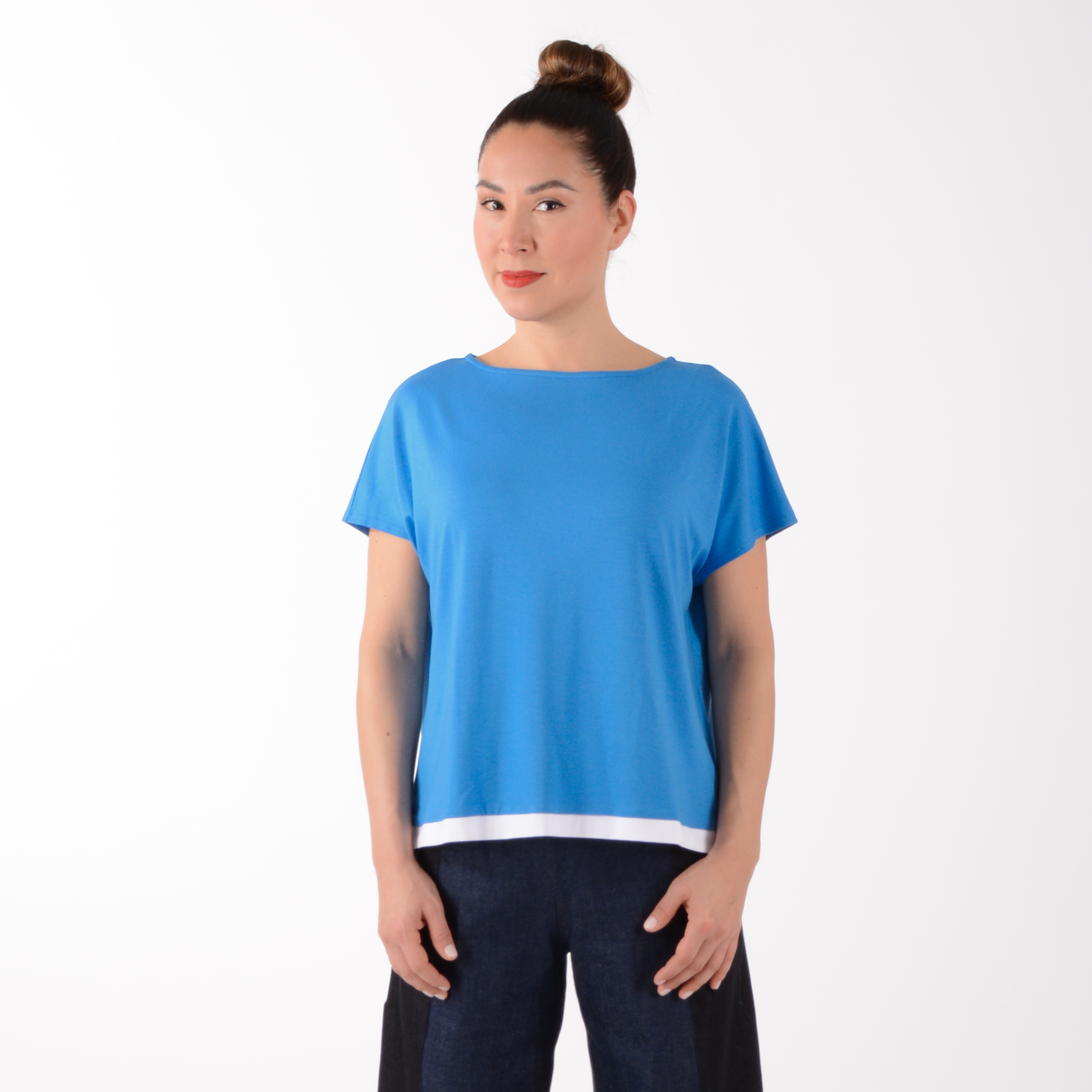 Aus hochwertigem Viskose Jersey in frühlingshaften Blau mit weißem Saum.