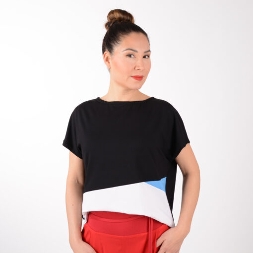 Aus hochwertigem Viskose Jersey in schlichtem Schwarz mit Details in Blau und Weiß als dezenter Blickfang.