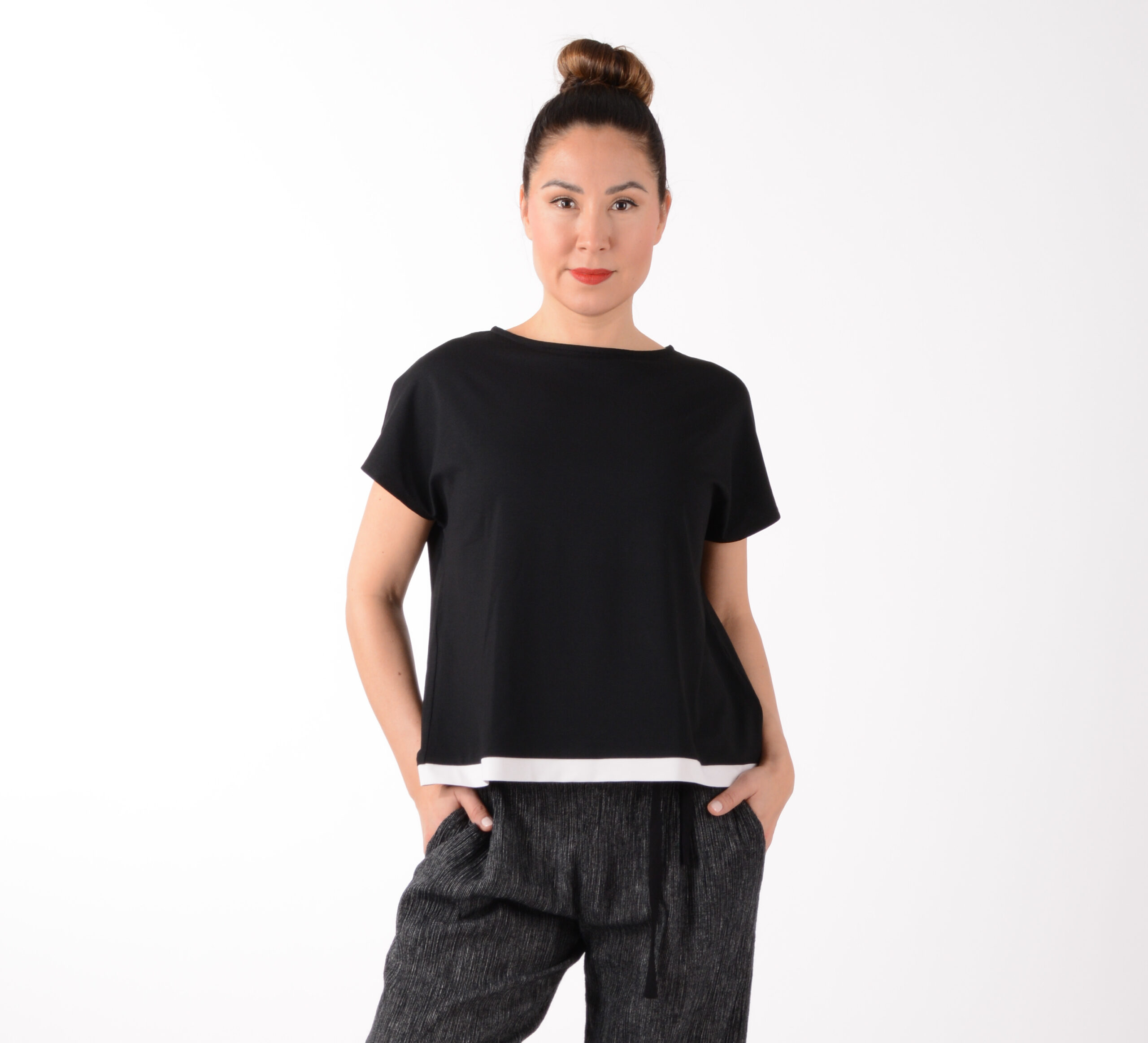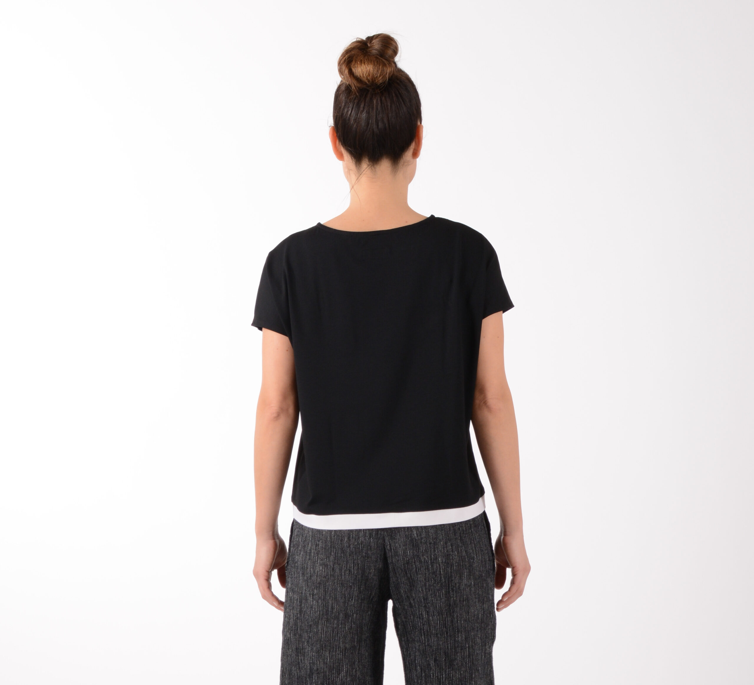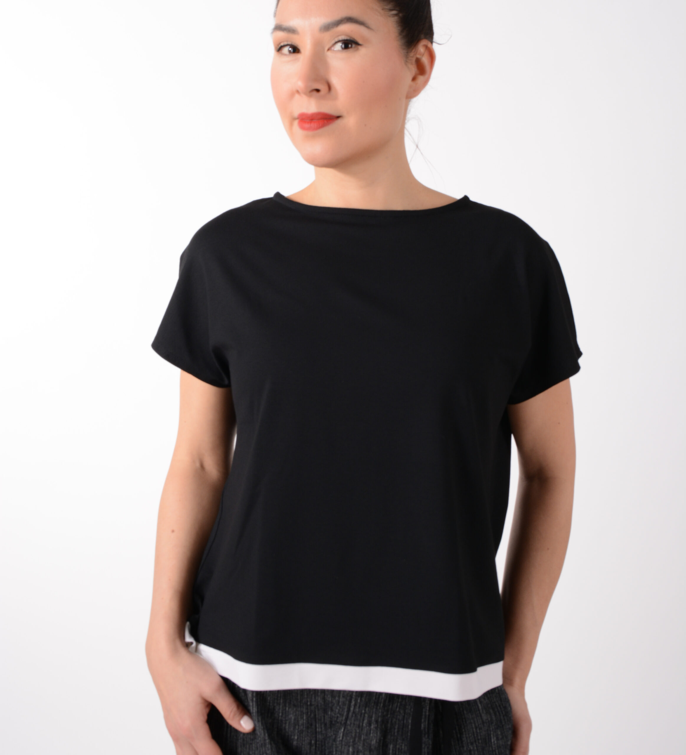 Aus hochwertigem Viskose Jersey in schlichtem Schwarz mit Cremeweißen Saum als dezenter Blickfang.