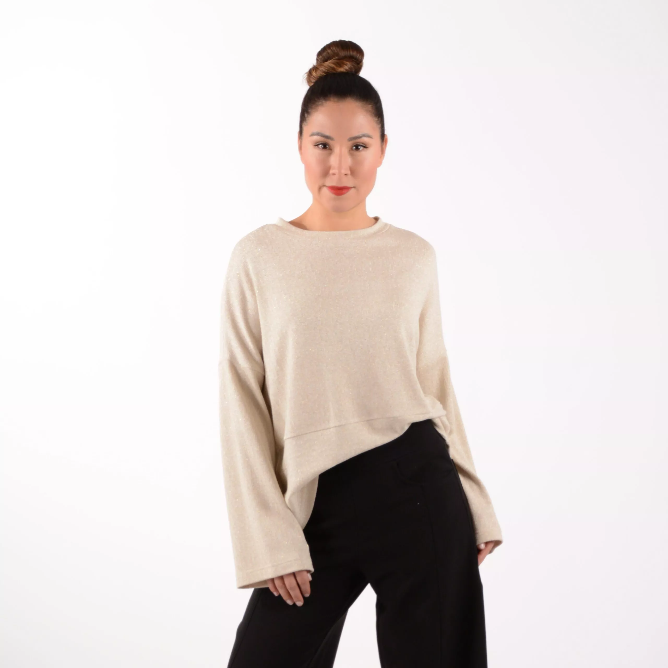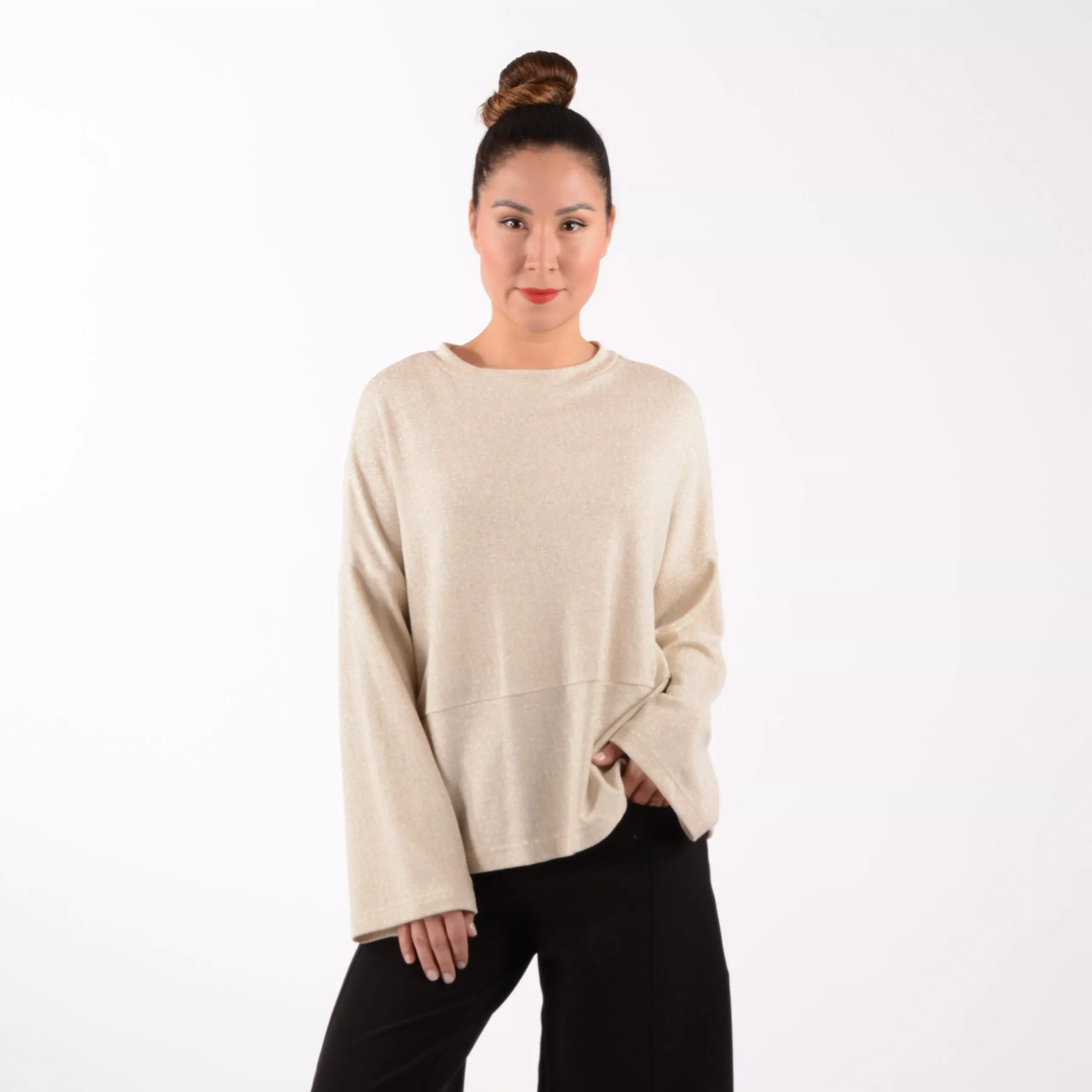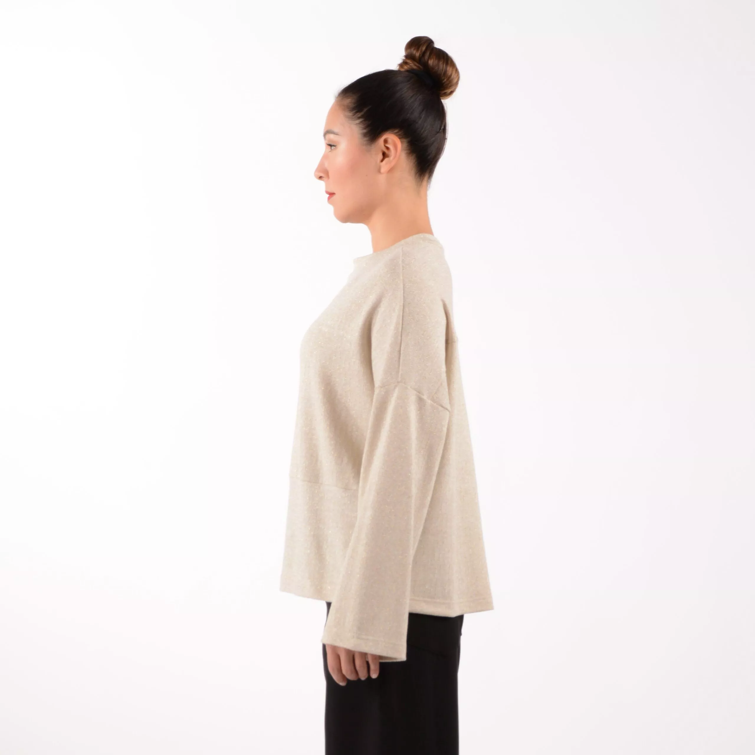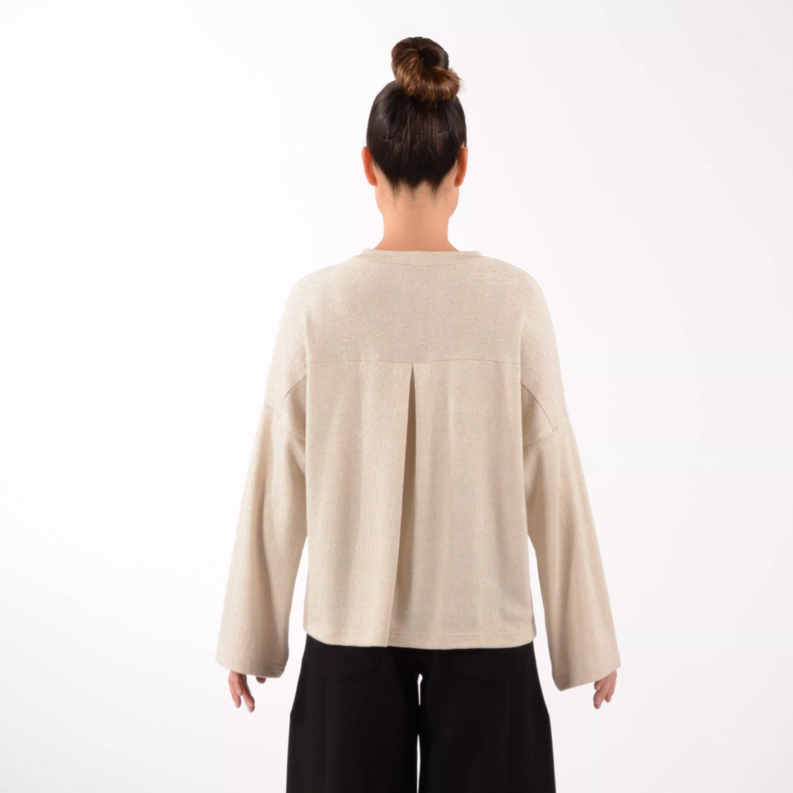 Shirt SUKI aus Viskose Strick Material mit glänzenden Goldfäden und Quetschfalte im Rücken.