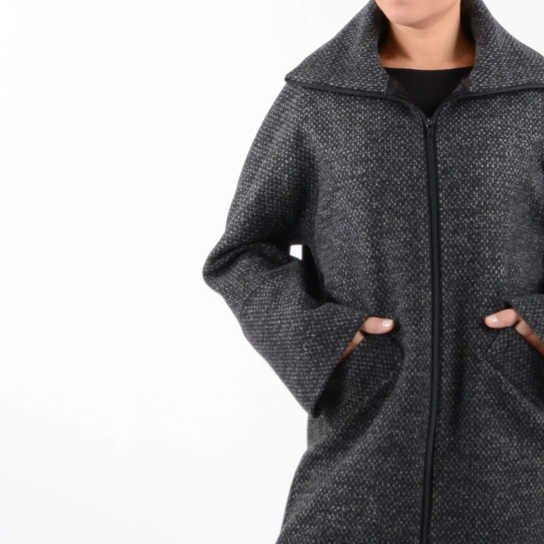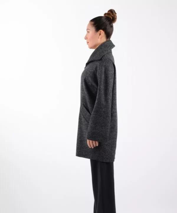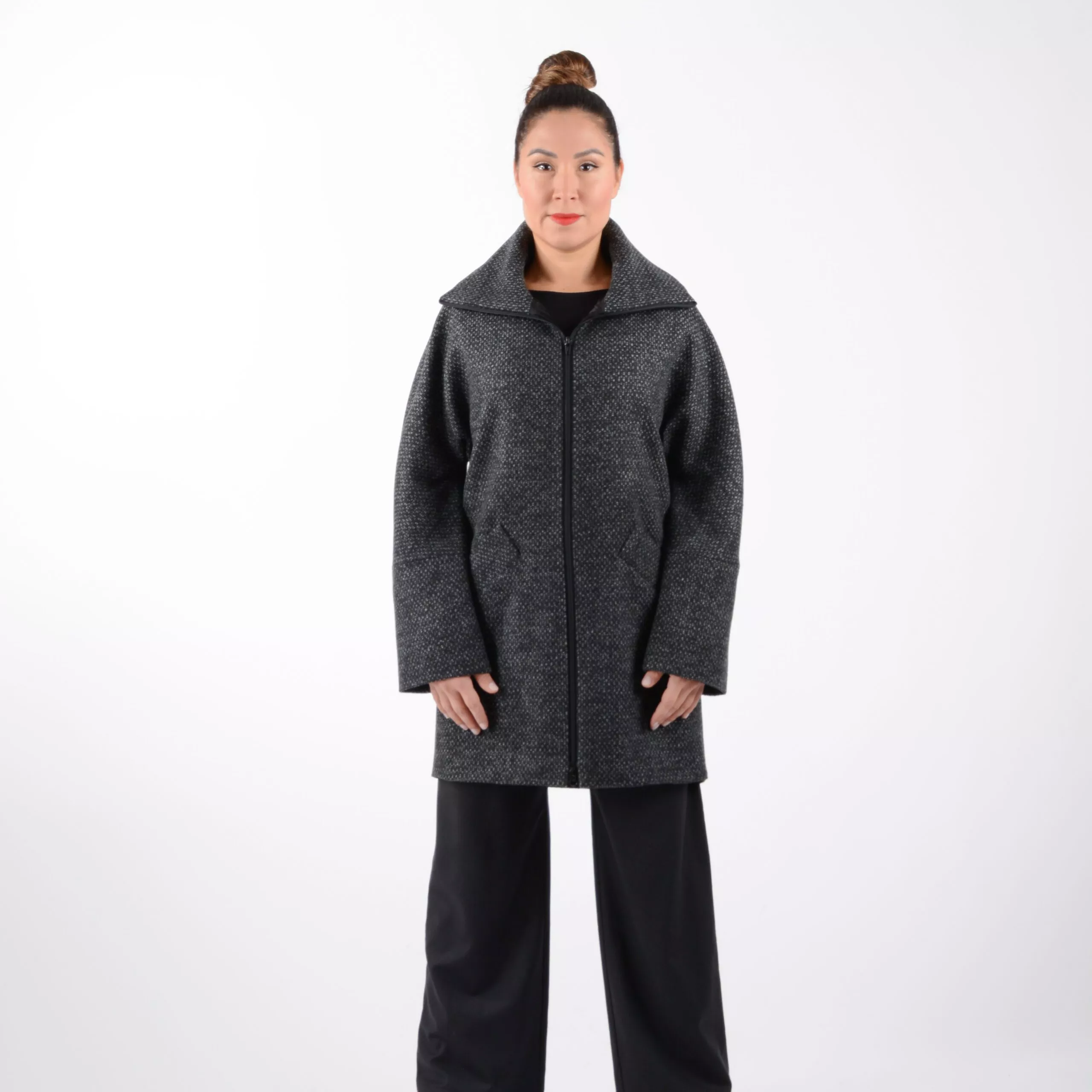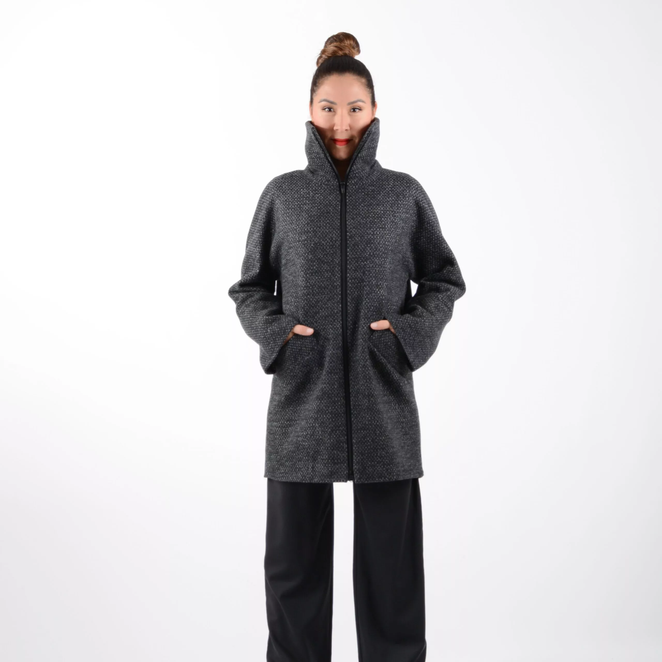 Die „Woll-Zipp-Jacke“ in Grau ist eine legere, bequeme Winterjacke. Die angeschnittene Ärmelform bietet genügend Platz für eine Pulli darunter. Der hohe Stehkragen kann umgelegt oder hochgeschlossen werden. Die Jacke hat Leistentaschen und einen Reissverschluss, welcher auch von unten zu öffnen ist – dadurch erhält man mehr Bewegungsfreiheit beim zB Sitzen, Radfahren usw. Das hochwertige Wollmaterial ist weich und wärmend, ohne dabei schwer zu sein.